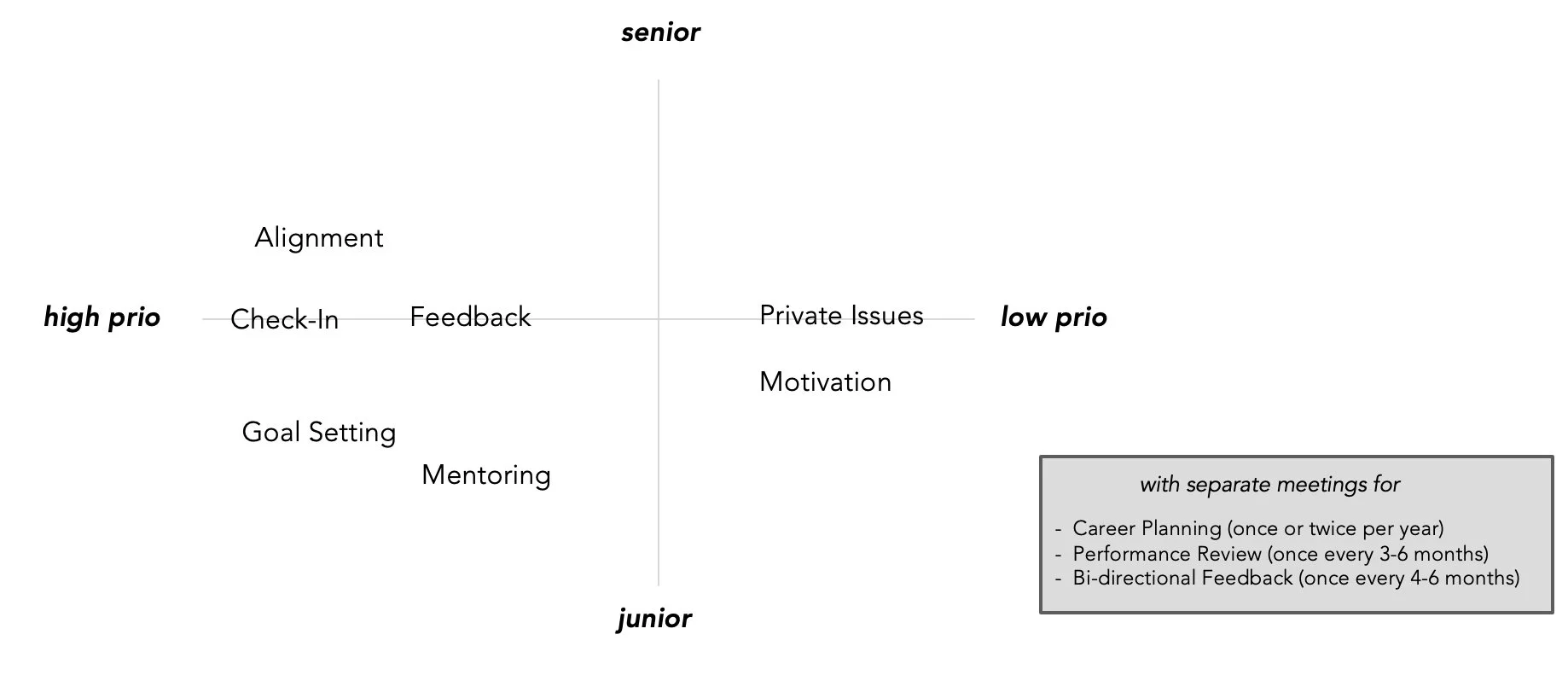 In reality, though, I believe that it’s better to use this framework only as a starting point, and agree on the focus of a particular one-on-one series with the respective direct report in a kick-off.
