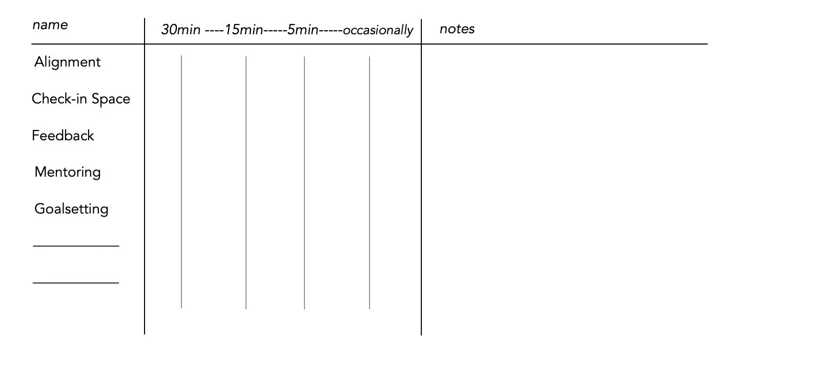 So why again the template, you ask? Because as much as it’s important for each meeting to be relevant in the now, it is important to have a clear frame for the kind of “current and relevant” that you want to talk about (and in particular to not transform the one-on-one into an operational problem-solving meeting - see Part 2). The template serves to guide you through a series of one-on-ones with consistency and purpose. It does not determine the details of each particular meeting.